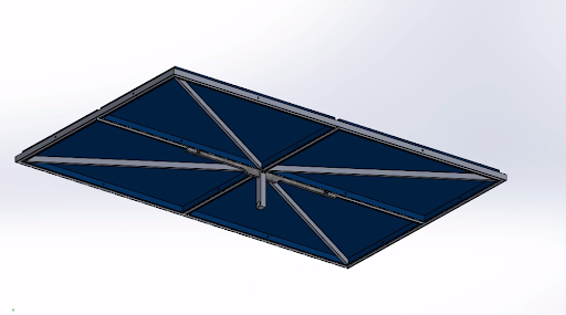Isometric view of 4 solar panels attached to frame which is connected to two bars that attach to the motor